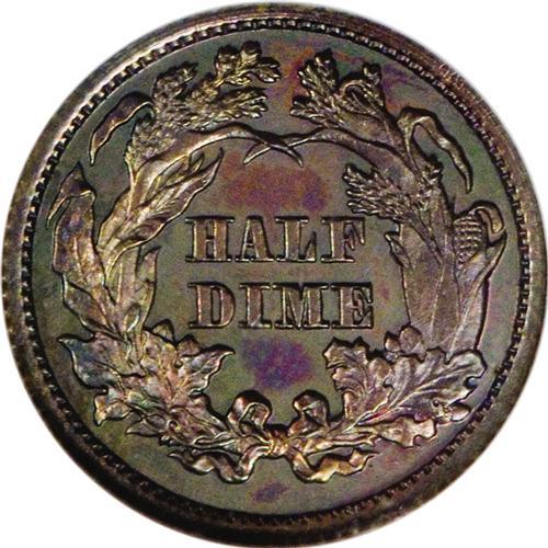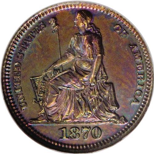 <B>1870 H10C Half Dime, Judd-817, Pollock-906, High R.6, PR65 Brown NGC.</B></I> William Barber's proposed Seated Liberty motif is paired with a regular reverse half dime die. Struck in copper with a reeded edge. About a dozen pieces are known. Vividly toned rose-red, peach, and apple-green. The strike is exquisite, and the surfaces appear undisturbed by contact.<BR><BR><b>Shipping:</b> Coin/Currency (<a target="_blank" href="http://www.heritageauctions.com/common/shipping.php">view shipping information</a>)