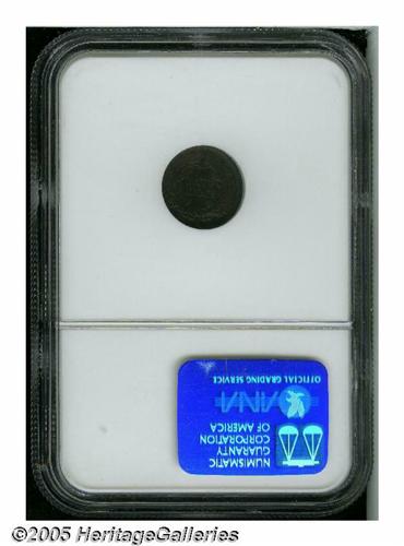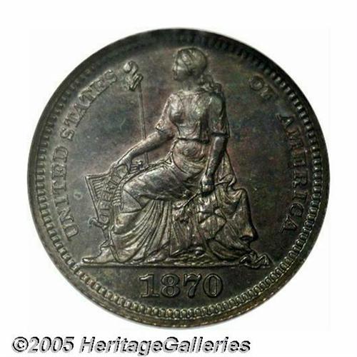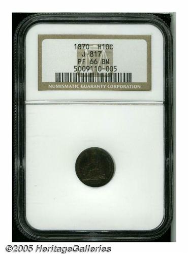 <B>1870<H10C> Half Dime, Judd-817, Pollock-906, High R.6, PR66 Brown NGC.</B></I> A seated figure of Liberty, designed by William Barber, faces left with a globe and free-standing liberty pole. The reverse is the same design used to coin regular issue 1870 half dimes. Struck in copper with a reeded edge. Like the Judd-815 above, only a dozen or so pieces are believed known of this pattern. Fully struck throughout, the surfaces have a deep gray-brown cast overall with iridescent rose and sea-green undertones. Lightly spotted.<BR><I>From The Western Hills Collection.</B></I>