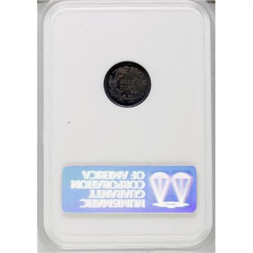 <B>1870 H10C PR65 NGC.</B></I> A deep layer of original toning blankets both sides of this Gem proof half dime. Razor-sharp striking details are readily evident on all of the design elements, including the denticles. Only a faint milky patch in the right obverse field precludes an even loftier grade designation. Census: 32 in 65, 29 finer (6/07). <BR><BR><b>Shipping:</b> Coins & Currency (<a target="_blank" href="http://www.heritageauctions.com/common/shipping.php">view shipping information</a>)
