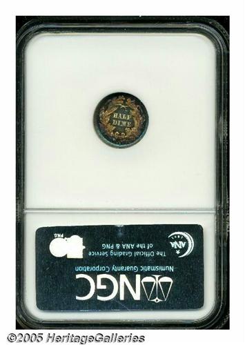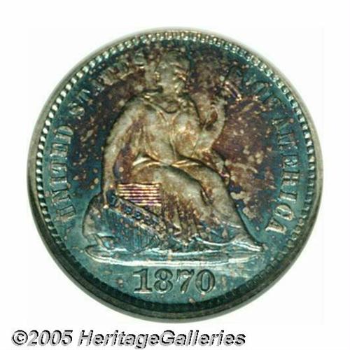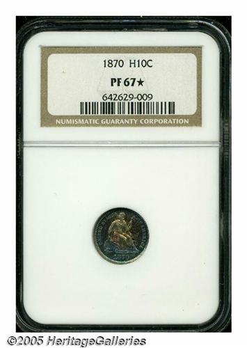 <B>1870<H10C> PR67 <S NGC.</B></I> Not since the amazing Kaufman specimen have we seen an 1870 Half Dime of such extraordinary eye appeal and quality. Mottled neon-blue, rose, and orange iridescence leaves a small area of brilliance at the center of the reverse, but has no ill-effect on the coin's intense reflectivity. Population: 1 in 67 <S, 0 finer (4/05).