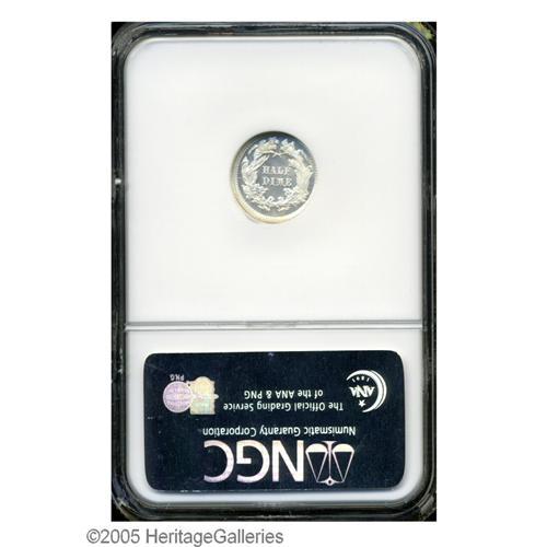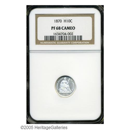 <B>1870<H10C> PR68 Cameo NGC.</B></I> Crisp well defined details struck on frosty surfaces, contrasting nicely against deeply mirrored fields bursting with dazzling reflectivity. This silver-white example is tied with three others, at PR68, as the finest known specimen of the 1870 half dime (at NGC), but none of the other coins have Cameo or Deep Cameo contrast. PCGS has not certified an example of this issue above the PR67 grade level. The 1870 proof half dime is seldom encountered with the Cameo designation, moreover, despite a mintage of 1,000 proofs. Population: 1 in PR68 Cameo, 0 finer (10/05).