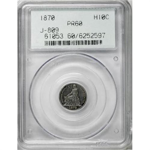 <B>1870 H10C Standard Silver Half Dime, Judd-809, Pollock-897, Low R.7, PR60 PCGS.</B></I> William Barber's Seated Liberty design is paired with a familiar Standard Silver reverse motif, a wreath of corn and cotton and 5 CENTS in the center. Struck in silver with a reeded edge. Cleaned at one time, the surfaces are still mostly brilliant with an outline of blue-gray around the devices.<BR><BR><b>Shipping:</b> Coins & Currency (<a target="_blank" href="http://www.heritageauctions.com/common/shipping.php">view shipping information</a>)