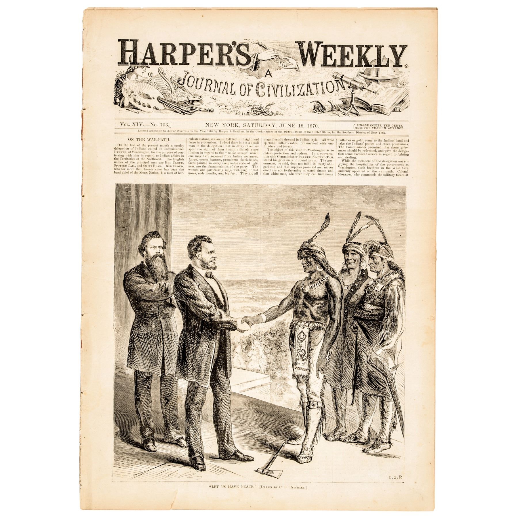 Impressive cover artwork shows an engraving of President Grant greeting Native American Indian Chiefs Red Cloud, Spotted Tail, and Swift Bear, a Peace Pipe Tomahawk shown laid down on the floor, with the caption below reading, “Let Us Have Peace.” Initials “C.S.R.” as the engraver in the lower right corner. Also, captioned above begins and article plus an interior full horizontal page of “Indians on the War Path.”