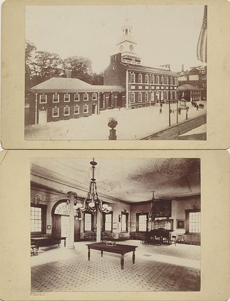 A great collection of five ca. 1870 cabinet cards related to the signing of the Declaration of Independence. Includes: a view of Carpenter's Hall identified on the verso as: "The Hall where the first Continental Congress was held Sept. 5, 1774"; a view of Carpenter Hall's interior; a view of Rev. Duche, Rector of Christ Church giving the first prayer to the first Continental Congress in Carpenter Hall on Sep. 5, 1774; a view of Independence Hall; and an albumen of Charles Weisgerber's painting titled "Birth of Our Nation's Flag" showing Betty Ross sewing the first flag before George Washington, George Ross and Robert Morris. Overall very good.