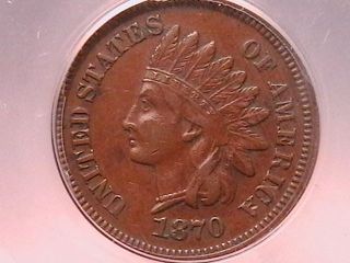 1870 Indian CentXF40 Damaged ANACS.The grade is XF40, but there is no damage. There is a small area on the lower reverse that was wiped and lost a little toning.