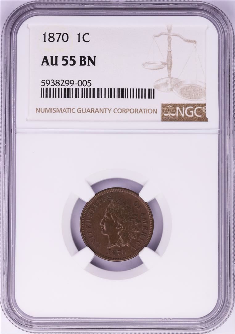 One 1870 Indian Head Cent Coin NGC AU55 BN. NGC Certified.