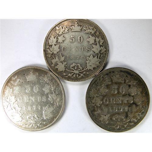 Canada Fifty Cents 1870 LCW, 1871 and 1892 Obverse 4, all VG and pale toned to light-medium toned