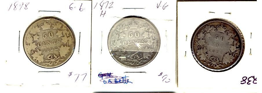 1870 LCW, 1872H & 1898 50¢. Lot of 3 coins G4 to G6.