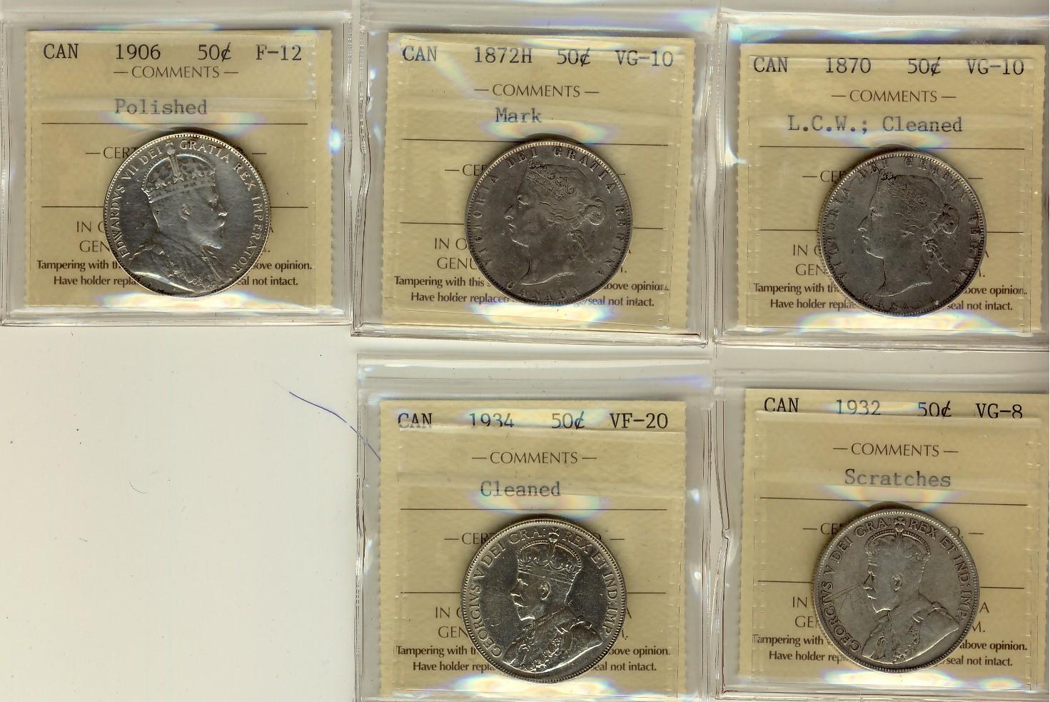 1870 LCW VG10, 1872H VG10, 1906 F12, 1932 VG8 & 1934 VF20 50¢. Lot of 5 coins all designated with p