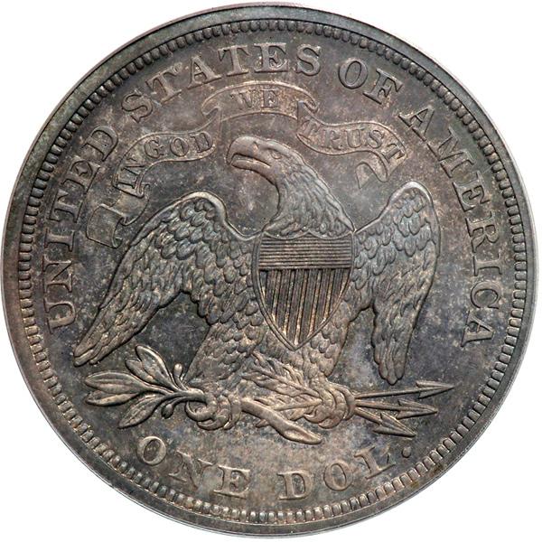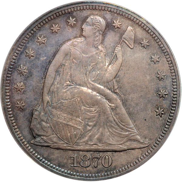 1870 Liberty Seated Dollar. PCGS graded Proof 64. Only 1,000 Proofs struck. Nice even gold and lilac toning, a sharply struck coin that has outstanding detail on the main devices. Very choice with only a few stray hairlines. Pop 53; 21 finer, 17 in 65, 3 in 66, 1 in 67 (PCGS # 7018) .