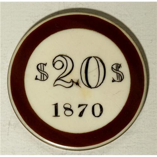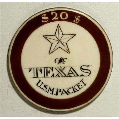 <B>1870 MS Star of Texas Gaming Chip.</B></I> This is a $20 denomination gaming chip used aboard the <I>U.S.M Packet Star of Texas</B></I> riverboat during the late 19th century. A small accompanying card explains: "This is an authentic Mississippi River Boat Gambling chip used during the mid 1800's. The chip is hand carved walrus ivory."<BR> Packet boats were the steamboats used on the Mississippi river system, carrying both passengers and mail, thus the U.S.M. (U.S. mail) designation. Many of these vessels had their own postmarks. We have been unable to learn any further history of the individual vessel.<BR><I>From The Collection of Louis E. Eliasberg, Sr.</B></I><BR><BR><b>Shipping:</b> Coin/Currency (<a target="_blank" href="http://www.heritageauctions.com/common/shipping.php">view shipping information</a>)