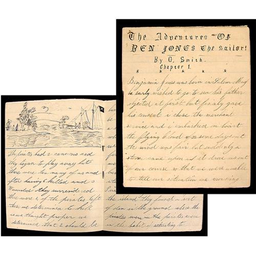 <Our item number 140068><B>1870 Manuscript "The Adventures of Ben Jones the Sailor!"</B> Handwritten booklet: "The Adventures of Ben Jones the Sailor!" By G. Smith, 11 pp., 4 x 5 in., Salem, 1870. Includes drawings in the manuscript plus and an inserted drawing. The manuscript was found near Salem, Massachusetts and is the story of Benjamin Jones of Salem, Mass., a sailor aboard the ship "Flying Cloud" who has adventures with Pirates, natives of the Society Islands, etc. Fine. <BR>Estimated Value $300 - 400. <BR><BR>Our item number 140068<BR><IMAGES><P ALIGN="CENTER"><IMG SRC="http://www.goldbergcoins.net/liveauction/49jpegs/140068.jpg"> <BR><IMG SRC="http://www.goldbergcoins.net/liveauction/49jpegs/140068N2.jpg"> </P></IMAGES>