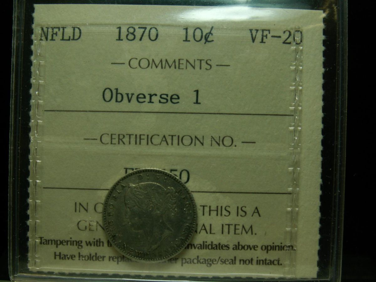 1870 NFLD 10¢ Obv 1 ICCS VF20