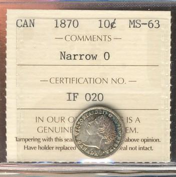 1870 Narrow 0 10¢ ICCS MS63, great lustre under some nice rainbow tone.