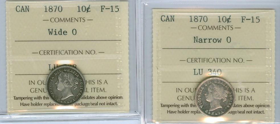 1870 Narrow and 1870 Wide Lot of 2 ICCS graded 10¢ coins, both F15.