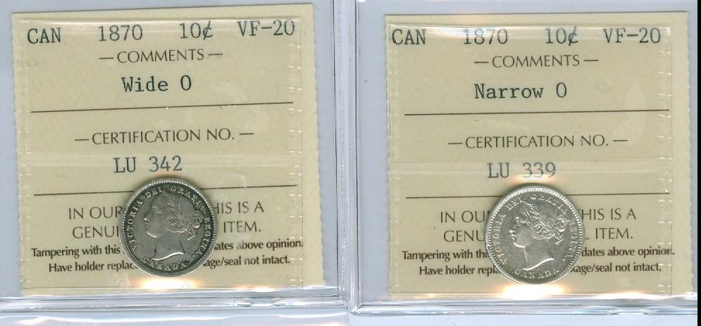 1870 Narrow and 1870 Wide Lot of 2 ICCS graded 10¢ coins, both VF20.