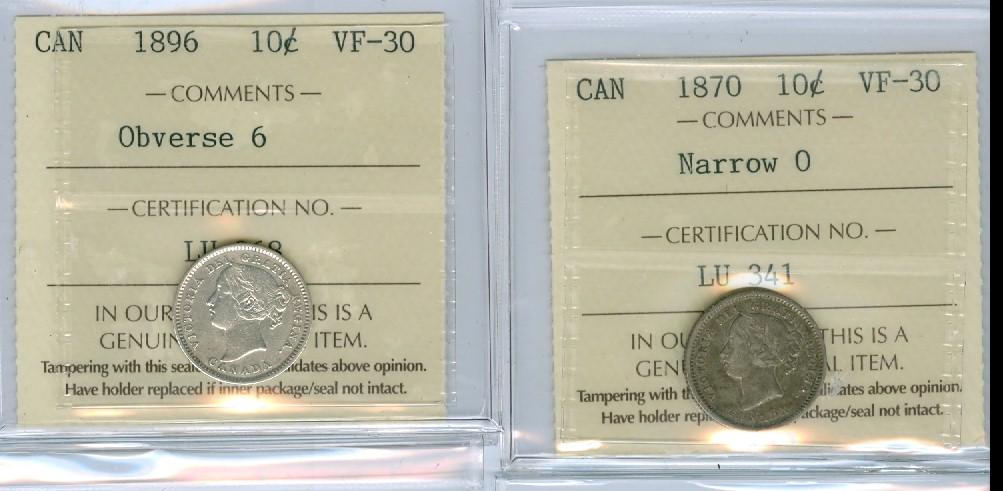 1870 Narrow and 1896 Obv.6 Lot of 2 ICCS graded 10¢ coins, both VF30.
