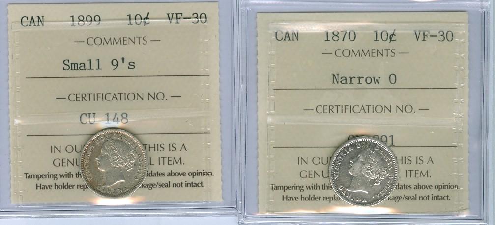 1870 Narrow and 1899 Small 9's. Lot of 2 ICCS graded 10¢ coins, both VF30.
