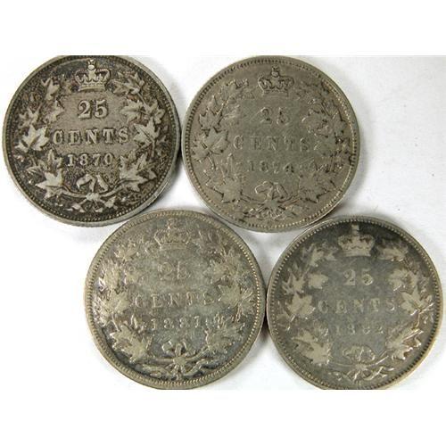 Canada Twenty-Five Cents 1870 Obverse 1, 1874H, 1881H and 1882H, all Fine and pale to lightly toned
