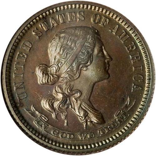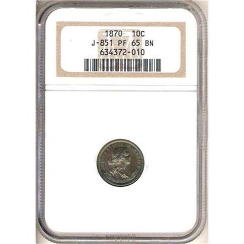 <b>1870 Pattern Dime. Copper, reeded edge. Judd-851. Pollock-958. NGC graded PF65 BR.</b> A lovely little example of the STANDARD SILVER series of patterns from 1869-71, featuring a range of heads for Liberty and one of several reverse styles. Lustrous, glowing, attractively toned <b>(PCGS # 61095)</b>