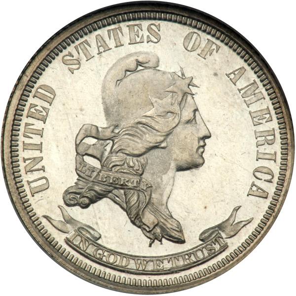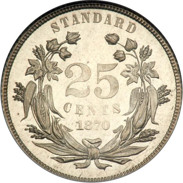 1870 Pattern Quarter Dollar. Silver, reeded edge. Judd-888. Pollock-987. Rarity 5. NGC graded Proof 66 Cameo. A full white Gem Cameo Proof. Part of the STANDARD SILVER series of Pattern coins made in all sizes from the little half dime to the large, crown-sized silver dollar. Highly presentable with its flashy originality. The devices well frosted and free from problems of any sort. Pop 1; none finer.