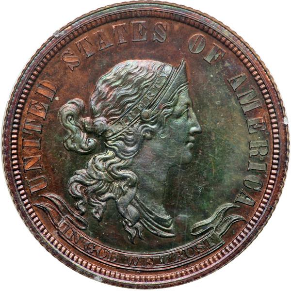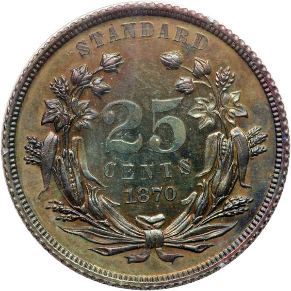 Historic note: The year 1869 marked the advent of a remarkable series of Pattern pieces, known as the Standard Silver series, which were intended to be used to replace the fractional currency. This consisted of denominations of fifty, twenty-five and ten cents which were smaller in size and lighter in weight than the regular United States coins of equal denomination. They were to be struck in the same silver alloy as the authorized United States silver coins, but the weight of the half dollar was to be reduced from 192 to 154 grains, the quarter from 96 to 77 grains and the dime from 38 1/10 to 31 1/2 grains. The intention of the reduced weight was to prevent hoarding and exportation. The value was to depend upon the authority of their Issue rather than upon their bullion value so that they might be current whether gold was at par with paper money or not. William Barber made dies for three different obverses for each denomination after designs by J. B. Longacre. These sets of nine pieces each were struck in silver, copper and aluminum with plain and reeded edges and sold at the mint for fifteen dollars a set.