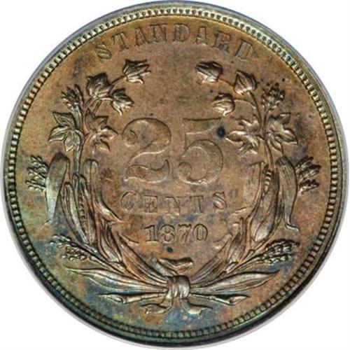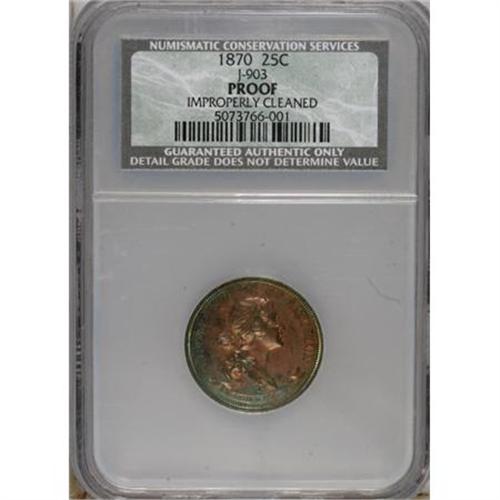 <B>1870 25C Standard Silver Quarter Dollar, Judd-903, Pollock-1018, High R.7--Improperly Cleaned--NCS. Proof.</B></I> The bust of Liberty faces right on the obverse with UNITED STATES OF AMERICA around and the motto IN GOD WE TRUST on a scroll below. Liberty's hair is tied in a bun. On the reverse, the denomination 25 CENTS and date 1870 are in a wreath of cotton and corn with the inscription STANDARD above. Struck in copper with a plain edge. This boldly struck example is recolored salmon-pink and sea-green, but is nonetheless mark-free and attractive.<BR><BR><b>Shipping:</b> Coins & Currency (<a target="_blank" href="http://www.heritageauctions.com/common/shipping.php">view shipping information</a>)
