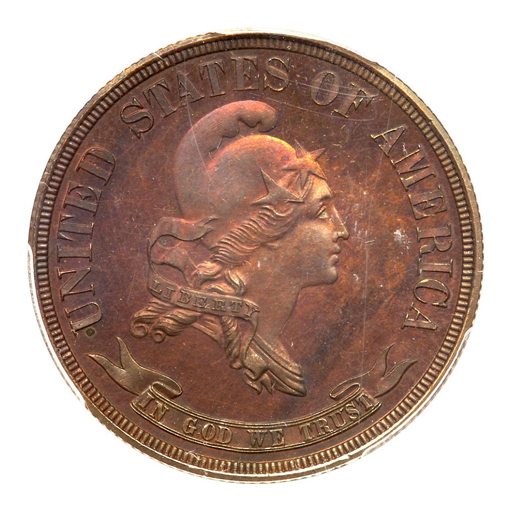 1870 Pattern Half Dollar. Copper, reeded edge. Judd-947. Pollock-1075. Rarity 7. PCGS graded Proof 66 Brown. CAC. PQ. The obverse design includes a Liberty head with cap and two stars, LIBERTY in raised letters, without B on ribbon. The reverse shows an open agricultural wreath enclosing 50 CENTS / STANDARD at border above. Boldly struck and well preserved, with satin brown with iridescent shades. Wonderful rainbow toning on both sides. Pop 1; the finest example graded at both services. PCGS # 61193 Estimated Value 5,000 - UP
