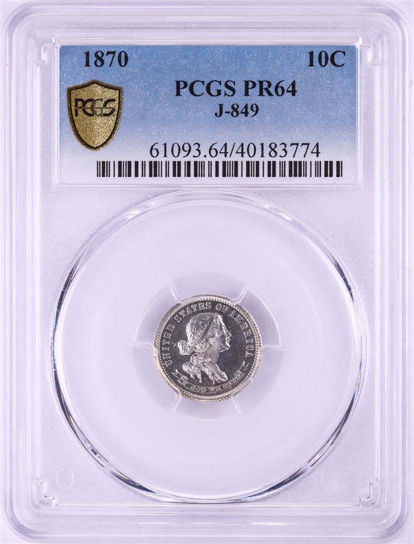 One 1870 Proof Pattern Liberty Dime Coin PCGS PR64 J-849. PCGS Graded.