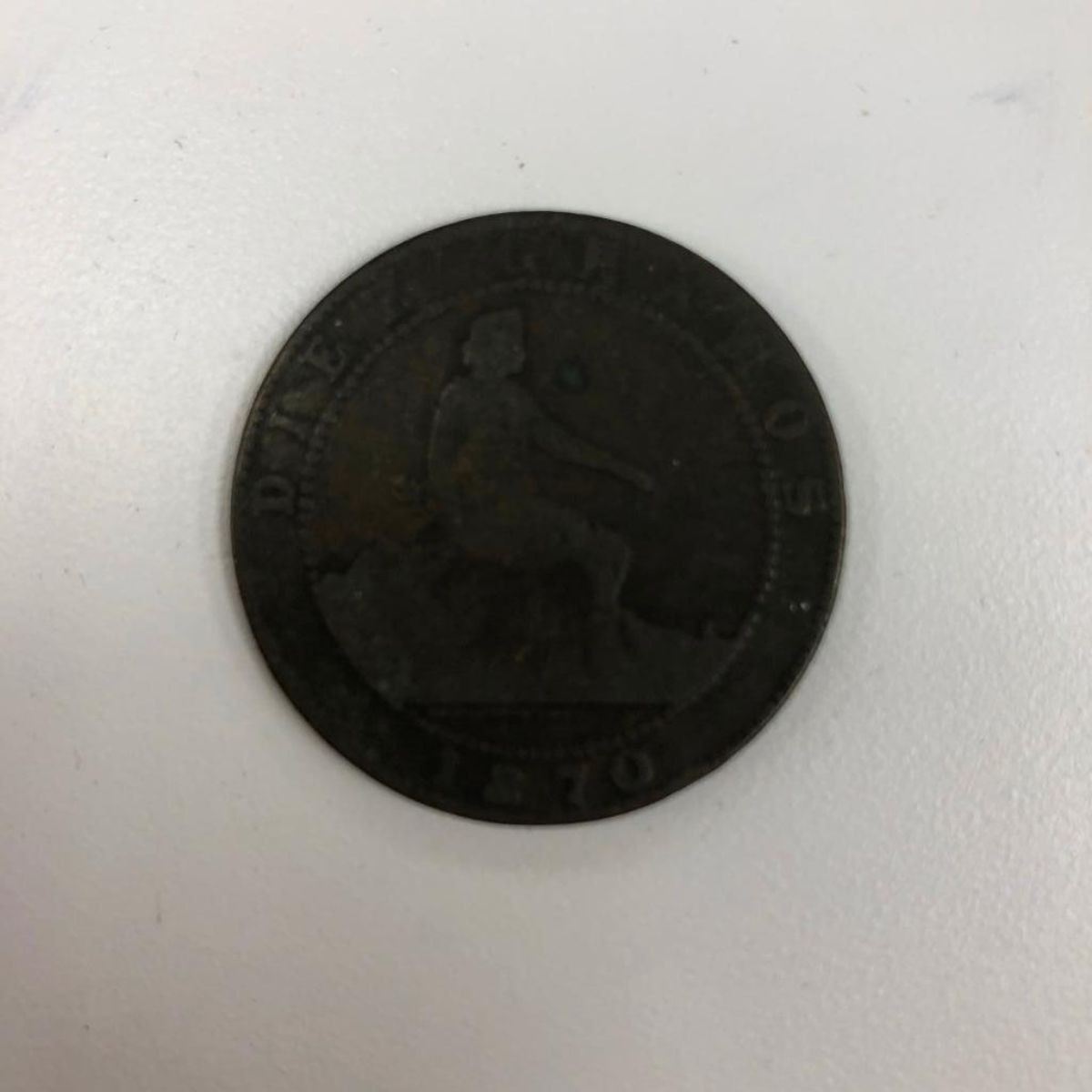 Obverse Seated Hispania facing right within beaded circle 'Diez gramos' is the weight (10 grams) Designer L.Planiol Lettering: DIEZ GRAMOS L·MARCHIONNI 1870 Translation: TEN GRAMS L·MARCHIONNI 1870 Engraver: Luis Marchionni Reverse Lion and shield. 'Cien piezas en kilog' is 100 of 10 grams coins weigh 1 kilogram. OM are Oeschger Mesdach Lettering: CIEN PIEZAS EN KILOG· OM DIEZ CENTIMOS Translation: ONE-HUNDRED UNITS PER KILOG·(KILOGRAM) OM TEN CENTS Engraver: Luis Marchionni Specifications Country: Spain Period: Provisional Government (1868-1871) Type: Standard circulation coin Year: 1870 Value: 10 Centimos (0.1 ESP) Composition: Bronze Weight: 10 g Diameter: 30 mm Thickness: 1.6 mm Shape: Round