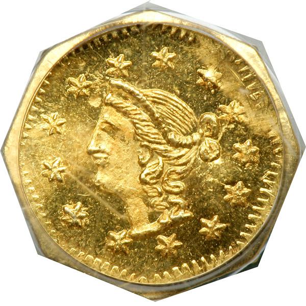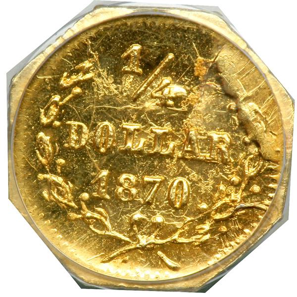 1870 Quarter Dollar Octagonal. PCGS graded MS-64. A choice example with blazing prooflike surfaces on both sides. Well struck stars and hair. Has a tiny planchet flake at the forehead. Pop 10; 2 finer in 65.