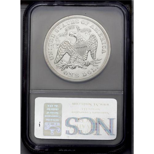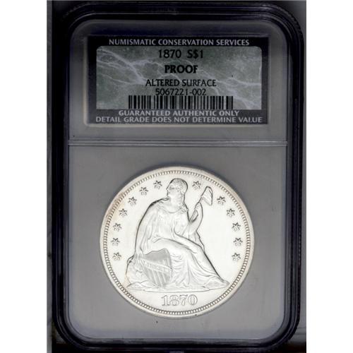 <B>1870<img border='0' src='http://www.heritagecoins.com/images/star.gif' width=10 height=10>$1>--Altered Surface--NCS. Proof.</B></I> This brilliant proof Seated Dollar does not exhibit highpoint friction, but the field reflectivity is diminished from dipping. Still a presentable example of this imposing proof type. <BR><BR><B>Important notice:</B> Heritage usually auctions material at the rate of 200-250 lots per hour. On some occasions eBay Live bid software or the Internet may not be able to keep up with the pace of the auction. We recommend placing a realistic absentee bid now as insurance to avoid disappointment. Occasionally the auctioneer may eliminate or reject an eBay Live bid, and the auctioneer may also reopen a lot after the close of the eBay live bidding (usually because we missed an audience bid), and may reject your bid even if it shows you as the winning bidder. By bidding via eBay Live, you agree that Heritage may award the lot to another bidder at its sole discretion under the circumstances described above or any other reasonable circumstances. Since eBay bids are not shown to us until we open the lot on the floor, we treat those bids just like floor bids. In most cases the floor responds before the eBay bid is presented to us, due to Internet lag time, so for consistency we have made it a policy that floor bids are always considered first over tie eBay live bids. Also please note that all Heritage lots purchased through eBay Live carry a 20% Buyer's Premium. Please make sure you read the Terms and Conditions before you bid. This lot is being auctioned in conjunction with a live floor auction by Heritage Galleries & Auctioneers. All final auction and invoice information will be supplied by Heritage Galleries & Auctioneers, and all other information should be considered preliminary. Lot:2209 <BR><BR><B>Winning Notification and Billing:</B> After the FINAL session in this auction is complete, Heritage will send e-mail and snail mail invoices. This process normally takes several days. All final auction and invoice information will be supplied by Heritage Galleries & Auctioneers, and all other information should be considered preliminary. <BR><BR>This auction will be conducted on a live auction floor and over the Internet through eBay Live. If you choose to place an absentee bid, please take a moment to <font color='#0000ff'><u><a href='http://pages.ebay.com/liveauctions/help/before/laabsentee.html'>learn how eBay Live absentee bidding works</a></u></font><font color='#000000'>
