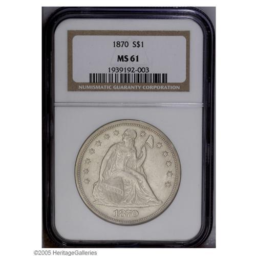 1870 S$1 MS61 NGC. Well struck with a smooth, satiny a 1870[S$1] MS61 NGC.