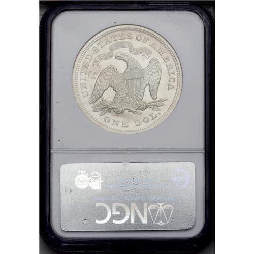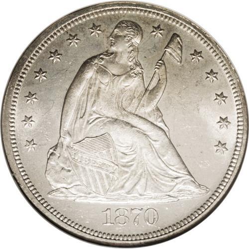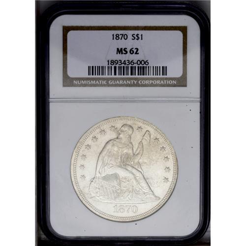 <B>1870<img border='0' src='http://www.heritagecoins.com/images/star.gif' width=10 height=10>$1> MS62 NGC.</B></I> While the 1870 dollar is relatively plentiful in circulated grades, Mint State coins are elusive. NGC and PCGS combined have certified around 120 Uncirculated pieces, about 30 or so of which are in MS62, the grade of the coin offered in this lot. The outstanding feature on this coin is its strike, which is better than usually seen on the issue. The star centers in particular are bold, which on many examples are often weak. Good definition is also apparent on Liberty's face and hair. The surfaces are nearly untoned, and exhibit soft luster. Some noticeable contact marks are visible on the right (left facing) hand, and a few smaller abrasions are noted on the face and in the obverse fields. <BR><BR><B>Important notice:</B> Heritage usually auctions material at the rate of 200-250 lots per hour. On some occasions eBay Live bid software or the Internet may not be able to keep up with the pace of the auction. We recommend placing a realistic absentee bid now as insurance to avoid disappointment. Occasionally the auctioneer may eliminate or reject an eBay Live bid, and the auctioneer may also reopen a lot after the close of the eBay live bidding (usually because we missed an audience bid), and may reject your bid even if it shows you as the winning bidder. By bidding via eBay Live, you agree that Heritage may award the lot to another bidder at its sole discretion under the circumstances described above or any other reasonable circumstances. Since eBay bids are not shown to us until we open the lot on the floor, we treat those bids just like floor bids. In most cases the floor responds before the eBay bid is presented to us, due to Internet lag time, so for consistency we have made it a policy that floor bids are always considered first over tie eBay live bids. Also please note that all Heritage lots purchased through eBay Live carry a 20% Buyer's Premium. Please make sure you read the Terms and Conditions before you bid. This lot is being auctioned in conjunction with a live floor auction by Heritage Galleries & Auctioneers. All final auction and invoice information will be supplied by Heritage Galleries & Auctioneers, and all other information should be considered preliminary. Lot:2192 <BR><BR><B>Winning Notification and Billing:</B> After the FINAL session in this auction is complete, Heritage will send e-mail and snail mail invoices. This process normally takes several days. All final auction and invoice information will be supplied by Heritage Galleries & Auctioneers, and all other information should be considered preliminary. <BR><BR>This auction will be conducted on a live auction floor and over the Internet through eBay Live. If you choose to place an absentee bid, please take a moment to <font color='#0000ff'><u><a href='http://pages.ebay.com/liveauctions/help/before/laabsentee.html'>learn how eBay Live absentee bidding works</a></u></font><font color='#000000'>