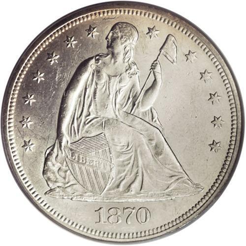 <B>1870 S$1 MS62 PCGS.</B></I> The 1870 dollar is relatively easy to acquire in circulated grades, but becomes somewhat more elusive in Mint State. The MS62 coin available for sale in the current lot is essentially brilliant, and exhibits sharply struck devices, save for minor softness in the star centers along the right border, which tends to be a major characteristic of this issue. Several small marks, particularly on the obverse, prevent a higher grade. Population: 22 in 62, 38 finer (3/07).<BR><BR><b>Shipping:</b> Coins & Currency (<a target="_blank" href="http://www.heritageauctions.com/common/shipping.php">view shipping information</a>)