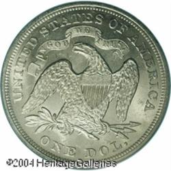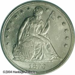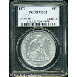 1870 S$1 MS63 PCGS. Talk about eye appeal on an MS <B>1870 S$1 MS63 PCGS.</B></I> Talk about eye appeal on an MS63 coin. This piece has deeply frosted, white surfaces that are fully bright and untoned. A few light abrasions do not detract from the stunning appearance of this piece, but explain the listed grade. Well defined overall including Liberty's head. Worth a close look and a spirited bid. Population: 20 in 63, 17 finer (10/04). <BR><BR><B>Important notice:</B> Heritage usually auctions material at the rate of 200-250 lots per hour. On some occasions eBay Live bid software or the Internet may not be able to keep up with the pace of the auction. We recommend placing a realistic absentee bid now as insurance to avoid disappointment. Occasionally the auctioneer may eliminate or reject an eBay Live bid, and the auctioneer may also reopen a lot after the close of the eBay live bidding (usually because we missed an audience bid), and may reject your bid even if it shows you as the winning bidder. By bidding via eBay Live, you agree that Heritage may award the lot to another bidder at its sole discretion under the circumstances described above or any other reasonable circumstances. Since eBay bids are not shown to us until we open the lot on the floor, we treat those bids just like floor bids. In most cases the floor responds before the eBay bid is presented to us, due to Internet lag time, so for consistency we have made it a policy that floor bids are always considered first over tie eBay live bids. Also please note that all Heritage lots purchased through eBay Live carry a 20% Buyer's Premium. Please make sure you read the Terms and Conditions before you bid. This lot is being auctioned in conjunction with a live floor auction by Heritage Galleries & Auctioneers. All final auction and invoice information will be supplied by Heritage Galleries & Auctioneers, and all other information should be considered preliminary. Lot:6391