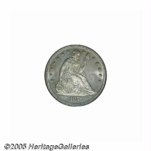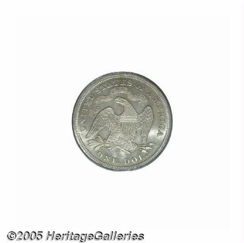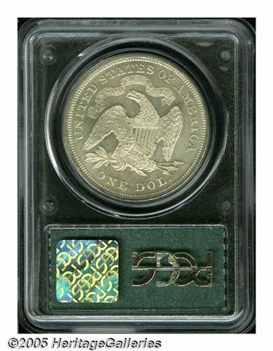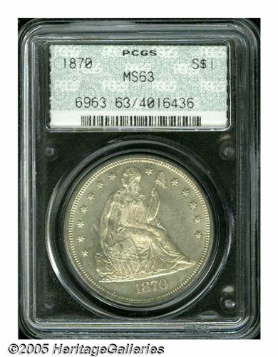 <B>1870<S$1> MS63 PCGS.</B></I> This lightly toned older holder Silver Dollar has impressive mint luster and a penetrating strike. The upper portion of the obverse shield is abraded, and the right obverse field has a few light marks. The reverse is die doubled throughout IN GOD WE TRUST and on the left (facing) wing feathers; the obverse die is identified by mint-made die 'rust' throughout the waist. Although the mintage of 415,000 business strikes is seemingly sufficient for Mint State examples to be available, such is not the case. It is likely there are less than 200 survivors in Uncirculated grades, about half of which are in MS60 to MS62 grades. Select examples are rare, and are strongly contested. Population: 20 in 63, 18 finer (6/05).<BR><I>From The Dr. John L. Pellegrini Collection of Liberty Seated Dollars.</B></I>