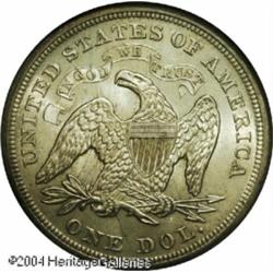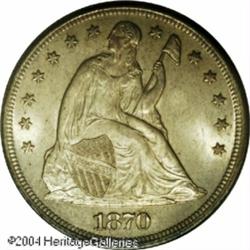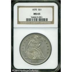 1870 S$1 MS65 NGC. It would appear that the 1870 i <B>1870 S$1 MS65 NGC.</B></I> It would appear that the 1870 is a fairly common Seated Dollar with a rather large mintage of 416,000 pieces. This is not the case, however, and the speculation is that quite a large number of this date were melted in 1918-20 under the Pittman Act. High grade coins are as difficult to locate as the several issues that precede it and, as with other dates, proofs are more available than business strikes. This coin has a satiny finish with a lightly toned, silver-gray appearance. Some slight weakness at the right portion of the obverse is noted, this probably being from improper die alignment. Population: 5 in 65, 0 finer (11/04). <BR><BR><B>Important notice:</B> Heritage usually auctions material at the rate of 200-250 lots per hour. On some occasions eBay Live bid software or the Internet may not be able to keep up with the pace of the auction. We recommend placing a realistic absentee bid now as insurance to avoid disappointment. Occasionally the auctioneer may eliminate or reject an eBay Live bid, and the auctioneer may also reopen a lot after the close of the eBay live bidding (usually because we missed an audience bid), and may reject your bid even if it shows you as the winning bidder. By bidding via eBay Live, you agree that Heritage may award the lot to another bidder at its sole discretion under the circumstances described above or any other reasonable circumstances. Since eBay bids are not shown to us until we open the lot on the floor, we treat those bids just like floor bids. In most cases the floor responds before the eBay bid is presented to us, due to Internet lag time, so for consistency we have made it a policy that floor bids are always considered first over tie eBay live bids. Also please note that all Heritage lots purchased through eBay Live carry a 20% Buyer's Premium. Please make sure you read the Terms and Conditions before you bid. This lot is being auctioned in conjunction with a live floor auction by Heritage Galleries & Auctioneers. All final auction and invoice information will be supplied by Heritage Galleries & Auctioneers, and all other information should be considered preliminary. Lot:6392
