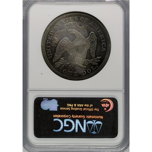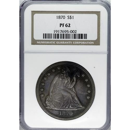 <B>1870 S$1 PR62 NGC.</B></I> Despite the sizable official mintage for this proof dollar, fewer examples are known of it than of the With Motto pieces of prior years. Most scholars speculate that examples were melted, though the truth remains a numismatic enigma. Gold, aqua, and violet patina covers most of the surfaces, while the centers have significant silver-gray patina. Modestly reflective but boldly defined with scattered hairlines in the fields.<BR><BR><b>Shipping:</b> Coins & Currency (<a target="_blank" href="http://www.heritageauctions.com/common/shipping.php">view shipping information</a>)