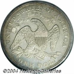 <table><tr><td><table><tr><td>1870 S$1 PR65 NGC. The 1870 is a deceptive issue among With Motto Seated dollars. Although it has a mintage of 1,000 proofs, it is nowhere near as available as one might believe, lagging far behind other dates such as the 1867, which had a mintage of only 625 pieces. Which leads one to speculate whether a number of proofs might have been melted as unsold at year's end. This is a sparkling, deeply mirrored Gem proof. The devices show a significant amount of mint frost and subsequent mild cameo contrast, this being evident even through the light golden-rose toning that covers each side. As one might assume from the grade, there are no obvious or distracting contact marks on either side, but there a numerous abrasions on the holder and the coin really needs to be re-encapsulated to bring out its full eye appeal. Population: 26 in 65, 9 finer (3/04). <BR><BR><B>Important notice:</B> Heritage usually auctions material at the rate of 200-250 lots per hour. On some occasions eBay Live bid software or the Internet may not be able to keep up with the pace of the auction. We recommend placing a realistic absentee bid now as insurance to avoid disappointment. Occasionally the auctioneer may eliminate or reject an eBay Live bid, and the auctioneer may also reopen a lot after the close of the eBay live bidding (usually because we missed an audience bid), and may reject your bid even if it shows you as the winning bidder. By bidding via eBay Live, you agree that Heritage may award the lot to another bidder at its sole discretion under the circumstances described above or any other reasonable circumstances. Since eBay bids are not shown to us until we open the lot on the floor, we treat those bids just like floor bids. In most cases the floor responds before the eBay bid is presented to us, due to Internet lag time, so for consistency we have made it a policy that floor bids are always considered first over tie eBay live bids. Also please note that all Heritage lots purchased through eBay Live carry a 20% Buyer's Premium. Please make sure you read the Terms and Conditions before you bid. <BR><BR><B>IMPORTANT ANNOUNCEMENT ABOUT RESERVES:</B> Heritage now divulges all reserves on its web site 7 days before every auction. If you want to know whether the reserve on this lot has been met, and if not, what the reserve amount is, please visit this lot page on the HeritageCoin.com web site, or email: bid@HeritageGalleries.com </span></font></td></tr></table></td></tr></table>