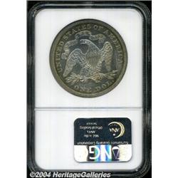 <B>1870<S$1> PR65 NGC.</B></I> Scarcer than the four preceding dates in the With Motto series, the 1870 presents the collector and researcher with the question of why this so. The mintage of proofs was notably high for the era with 1,000 pieces struck. The most obvious answer to the question posed above is that this date was not as popular as Mint officials estimated it would be (as happened in 1860) and many were melted as unsold at year's end. This is a flashy, deeply mirrored example that is light in color overall with powder-blue accents around the peripheries. There are very few technical flaws on either side. One interesting aspect of this coin is the irregular striking definition. The obverse displays the pinpoint striking details one would expect from a proof, but on the reverse the center is notably weak on the eagle's left (facing) leg, left wing, upper shield, and neck feathers. Population: 26 in 65, 9 finer (4/04). <BR><BR><B>Important notice:</B> Heritage usually auctions material at the rate of 200-250 lots per hour. On some occasions eBay Live bid software or the Internet may not be able to keep up with the pace of the auction. We recommend placing a realistic absentee bid now as insurance to avoid disappointment. Occasionally the auctioneer may eliminate or reject an eBay Live bid, and the auctioneer may also reopen a lot after the close of the eBay live bidding (usually because we missed an audience bid), and may reject your bid even if it shows you as the winning bidder. By bidding via eBay Live, you agree that Heritage may award the lot to another bidder at its sole discretion under the circumstances described above or any other reasonable circumstances. Since eBay bids are not shown to us until we open the lot on the floor, we treat those bids just like floor bids. In most cases the floor responds before the eBay bid is presented to us, due to Internet lag time, so for consistency we have made it a policy that floor bids are always considered first over tie eBay live bids. Also please note that all Heritage lots purchased through eBay Live carry a 20% Buyer's Premium. Please make sure you read the Terms and Conditions before you bid.