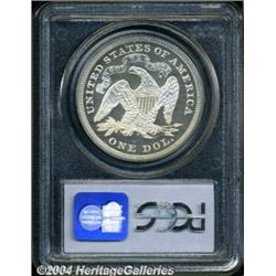 <B>1870<S$1> PR66 Deep Cameo PCGS.</B></I> The 1870 proof Dollar is a curious issue. There were 1,000 pieces struck, but apparently nowhere near that many were sold with the remainder being melted at year's end, making it scarcer than several of the preceding issues even though its mintage is higher. This is the first Deep Cameo we have offered for sale at public auction. The fields on this piece shimmer with bright, mirror-like intensity and show virtually no impairments, even under close examination. Set against the fields are the frosted white devices which seem even more contrasted because of the sparkling, illimitable depths of reflectivity seen in the fields. Brilliant throughout with just a bit of haziness on the obverse. As a future identifier, a small area of planchet roughness (as struck) is seen near the border at Liberty's foot. <BR><BR><B>Important notice:</B> Heritage usually auctions material at the rate of 200-250 lots per hour. On some occasions eBay Live bid software or the Internet may not be able to keep up with the pace of the auction. We recommend placing a realistic absentee bid now as insurance to avoid disappointment. Occasionally the auctioneer may eliminate or reject an eBay Live bid, and the auctioneer may also reopen a lot after the close of the eBay live bidding (usually because we missed an audience bid), and may reject your bid even if it shows you as the winning bidder. By bidding via eBay Live, you agree that Heritage may award the lot to another bidder at its sole discretion under the circumstances described above or any other reasonable circumstances. Since eBay bids are not shown to us until we open the lot on the floor, we treat those bids just like floor bids. In most cases the floor responds before the eBay bid is presented to us, due to Internet lag time, so for consistency we have made it a policy that floor bids are always considered first over tie eBay live bids. Also please note that all Heritage lots purchased through eBay Live carry a 20% Buyer's Premium. Please make sure you read the Terms and Conditions before you bid. </span></font></tr></table></td></tr></table>