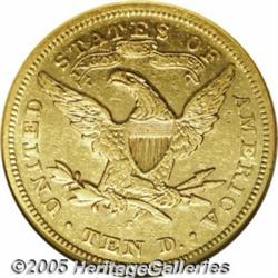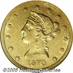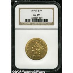 <B>1870-S $10 AU50 NGC.</B></I> The San Francisco Mint delivered just 8,000 Eagles in 1870, a year when Double Eagle production received a much higher priority. Incessant demand for the few Eagles that were produced reduced survivors of that petty mintage to a mere trickle, and those are nearly invariably low grade. This sterling representative is blessed with outstanding detail and luster, being also handsomely accented in natural copper-gold patina. A number of small to medium sized contact marks detract mildly from the still lustrous surfaces.