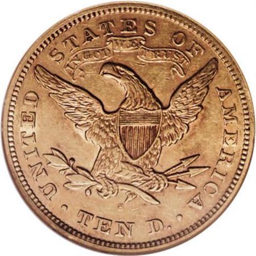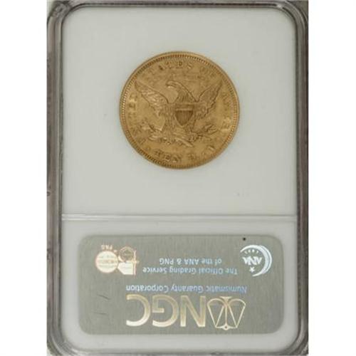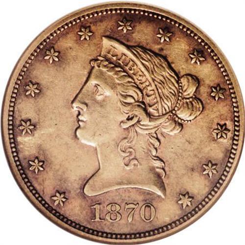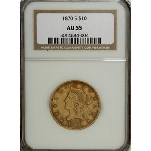 <B>1870-S $10 AU55 NGC.</B></I> The eagle denomination was rarely in demand until the late 1870s, and even San Francisco, the West Coast facility most associated with gold production in 1870, struck just 8,000 pieces that year. This well struck, briefly circulated example has only a handful of light marks on its still-lustrous peach-gold surfaces. A touch of softness is present in the centers, though the peripheral elements retain strong detail. Census: 10 in 55, 2 finer (6/07).<BR><BR><B>Coin Engraver:</B> Christian Gobrecht<BR><BR><b>Shipping:</b> Coins & Currency (<a target="_blank" href="http://www.heritageauctions.com/common/shipping.php">view shipping information</a>\)