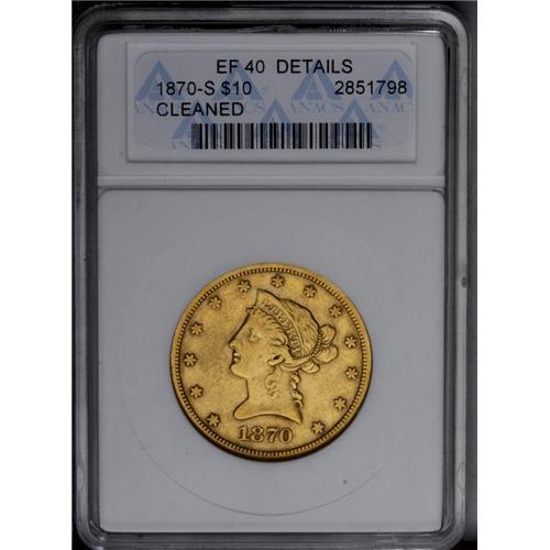<B>1870-S<$10>--Cleaned--ANACS. XF40 Details.</B></I> A moderately cleaned and circulated representative of this rare S-mint issue. Only 8,000 pieces were struck. Breen's diagnostic spur from the R in AMERICA is present.