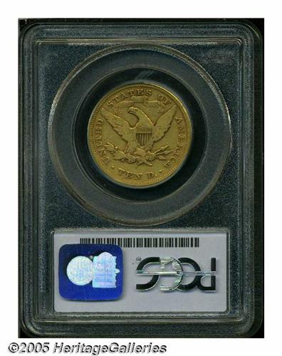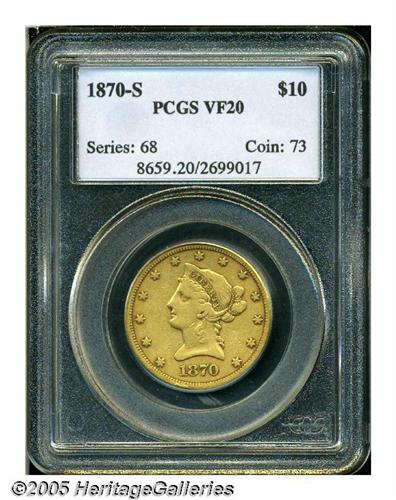 <B>1870-S<$10> VF20 PCGS.</B></I> A tan-brown representative of this rare issue, the fields are refreshingly smooth, and some plumage detail remains evident. The obverse rim at 6:30 has a few minor marks. A scant 8,000 pieces were struck, and no contemporary regard was given to saving examples for posterity. Population: 6 in 20, 40 finer (4/05).