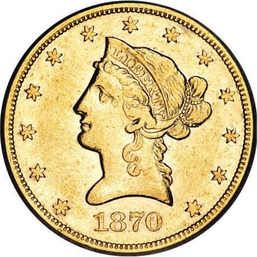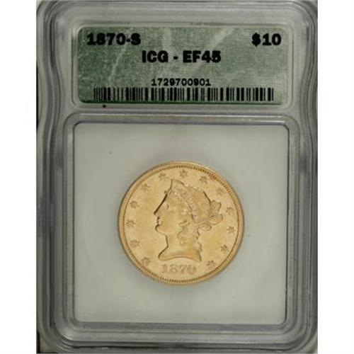 <B>1870-S $10 XF45 ICG.</B></I> A straw-gold colored example of this scarce issue. Luster is still seen in some areas surrounding the devices. A few abrasions and marks are noted, but none are inconsistent with the grade. Only 8,000 coins were minted and evidently few were saved. Between the two major grading services only one piece has been graded Mint State.<BR><BR><B>Coin Engraver:</B> Christian Gobrecht<BR><BR><b>Shipping:</b> Coins & Currency (<a target="_blank" href="http://www.heritageauctions.com/common/shipping.php">view shipping information</a>)