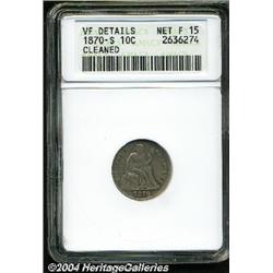 <B>1870-S<10C>--Cleaned--ANACS. VF Details, Net Fine 15.</B></I> A slightly subdued argent-gray piece with generally crisp definition, save for the center of the reverse, and no offensive abrasions. A rare date in higher circulated grades, only 50,000 pieces were struck. <BR><BR><B>Important notice:</B> Heritage usually auctions material at the rate of 200-250 lots per hour. On some occasions eBay Live bid software or the Internet may not be able to keep up with the pace of the auction. We recommend placing a realistic absentee bid now as insurance to avoid disappointment. Occasionally the auctioneer may eliminate or reject an eBay Live bid, and the auctioneer may also reopen a lot after the close of the eBay live bidding (usually because we missed an audience bid), and may reject your bid even if it shows you as the winning bidder. By bidding via eBay Live, you agree that Heritage may award the lot to another bidder at its sole discretion under the circumstances described above or any other reasonable circumstances. Since eBay bids are not shown to us until we open the lot on the floor, we treat those bids just like floor bids. In most cases the floor responds before the eBay bid is presented to us, due to Internet lag time, so for consistency we have made it a policy that floor bids are always considered first over tie eBay live bids. Also please note that all Heritage lots purchased through eBay Live carry a 20% Buyer's Premium. Please make sure you read the Terms and Conditions before you bid.