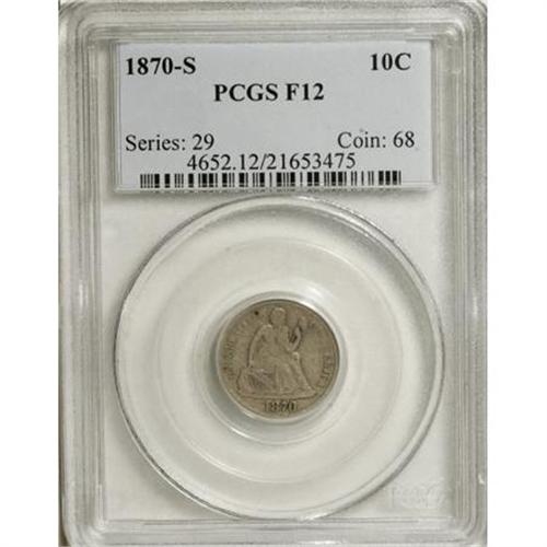<B>1870-S 10C F12 PCGS.</B></I> PCGS Population (3/39). NGC Census: (1/21). Mintage: 50,000. Numismedia Wsl. Price for NGC/PCGS coin in F12: $310. (#4652)<BR><BR><B>Coin Engraver:</B> Christian Gobrecht<BR><BR><b>Shipping:</b> Coins & Currency (<a target="_blank" href="http://www.heritageauctions.com/common/shipping.php">view shipping information</a>)