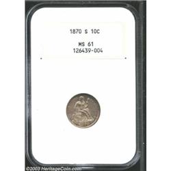 <TABLE cellSpacing=0 cellPadding=0 width="100%" bgColor=#000000 border=0><TBODY><TR><TD width="100%"><TABLE cellSpacing=1 cellPadding=3 width="100%" border=0><TBODY><TR><TD width="100%" bgColor=#79735c><FONT face=arial color=#ffffff size=3><B>Description</B> </FONT></TD></TR><TR><TD width="100%" bgColor=#ffffff><FONT face=arial size=2><B>1870-S 10C MS61 NGC.</B></I> Slate-gray and mauve colors endow this carefully preserved and typically struck piece. While admittedly not as desirable as the unique 1870-S Half Dime, only 50,000 pieces were minted, and Uncirculated survivors are decidedly rare. Population: 2 in 61, 11 finer (7/03). </FONT></TD></TR></TBODY></TABLE></TD></TR></TBODY></TABLE><BR><A name=PricesRealized></A><TABLE cellSpacing=0 cellPadding=0 width="100%" bgColor=#000000 border=0><TBODY><TR><TD width="100%"><TABLE cellSpacing=1 cellPadding=3 width="100%" border=0><TBODY><TR><TD width="100%" bgColor=#79735c><A name=PR><FONT face=arial color=#ffffff size=3><B>Previous Prices from Heritage Auctions</B> </FONT></A></TD></TR><TR><TD bgColor=#f6f6ed>No Prior Data Recorded </TD></TR><TR><TD bgColor=#ffffff><FONT face=arial size=1 ?>PLEASE NOTE: All prices realized reflect the final hammer price PLUS the buyer's premium in auctions that charge a buyer's premium. Each item has a notation at the top of the listing indicating whether that lot included a buyer's premium. Example: A item that sells with a final hammer price of $100 and a 20% buyer's premium will display with a price realized of $120. All information listed is intended to be as accurate as possible, but errors are possible. Please use this guide carefully and inform us of any inaccuracies. </FONT></TD></TR></TBODY></TABLE></TD></TR></TBODY></TABLE><BR><TABLE cellSpacing=0 cellPadding=0 width="100%" bgColor=#000000 border=0><TBODY><TR><TD width="100%"><TABLE cellSpacing=1 cellPadding=3 width="100%" border=0><TBODY><TR><TD width="100%" bgColor=#79735c colSpan=6><FONT face=arial color=#ffffff size=3><B>Price Guide*</B> </FONT></TD></TR><TR bgColor=#f6f6ed><TD align=middle><B>Grade</B> </TD><TD align=middle><B>Coin World<BR>(Trends)</B> </TD><TD align=middle><B>Numismedia<BR>Retail</B> </TD><TD align=middle><B>Numismedia<BR>Wholesale</B> </TD><TD align=middle><B>Coin<BR>Universe</B> </TD><TD align=middle><B>Heritage<BR>Value Index</B> </TD></TR><TR bgColor=#ffffff><TD align=middle>60</TD><TD align=right>$1,900.00</TD><TD align=right>---</TD><TD align=right>---</TD><TD align=right>$1,300.00</TD><TD align=right>$1,031.67</TD></TR><TR style="FONT-WEIGHT: bold" bgColor=#cccfdd><TD align=middle>61</TD><TD align=right>---</TD><TD align=right>---</TD><TD align=right>---</TD><TD align=right>---</TD><TD align=right>$1,145.00</TD></TR><TR bgColor=#ffffff><TD align=middle>62</TD><TD align=right>$2,050.00</TD><TD align=right>---</TD><TD align=right>---</TD><TD align=right>---</TD><TD align=right>$1,258.33</TD></TR><TR bgColor=#ffffff><TD colSpan=6><FONT size=1>*All information listed is intended to be as accurate as possible, but errors are possible. No item may be returned or refused based on this information which is provided as a service to our customers. You should contact each pricing source directly to determine the accuracy of this information. </FONT></TD></TR></TBODY></TABLE></TD></TR></TBODY></TABLE><BR><TABLE cellSpacing=0 cellPadding=0 width="100%" bgColor=#000000 border=0><TBODY><TR><TD width="100%"><TABLE cellSpacing=1 cellPadding=3 width="100%" border=0><TBODY><TR><TD width="100%" bgColor=#79735c><FONT face=arial color=#ffffff size=3><B>Population Guide</B> </FONT></TD></TR><TR bgColor=#ffffff><TD align=middle><!-- Begin Output of Population Grid--><TABLE cellSpacing=0 cellPadding=0 width="100%" border=0><TBODY><TR><TD vAlign=center><TABLE cellSpacing=0 width="100%" border=1 cellsadding="3"><TBODY><TR><TD vAlign=center><TABLE cellSpacing=0 cellPadding=3 width="100%" border=1><TBODY><TR><TD vAlign=center align=middle bgColor=#f0f1e8 colSpan=2 <CENTER><FONT face=Arial size=2><B>PCGS Pop </B></FONT><CENTER></CENTER></TD><TD vAlign=center align=middle bgColor=#f0f1e8 colSpan=2><CENTER><FONT face=Arial size=2><B>NGC Pop</B></CENTER></FONT></TD></TR><TR><TD vAlign=center><FONT face=Arial size=2>(61)</FONT> </TD><TD vAlign=center align=right><FONT face=Arial size=2>1</FONT> </TD><TD vAlign=center><FONT face=Arial size=2>(61)</FONT> </TD><TD vAlign=center align=right><FONT face=Arial size=2>2</FONT> </TD></TR><TR><TD vAlign=center><FONT face=Arial size=2>(>61)</FONT> </TD><TD vAlign=center align=right><FONT face=Arial size=2>14</FONT> </TD><TD vAlign=center><FONT face=Arial size=2>(>61)</FONT> </TD><TD vAlign=center align=right><FONT face=Arial size=2>11</FONT> </TD></TR></TBODY></TABLE></TD></TR></TBODY></TABLE></TD></TR></TBODY></TABLE><!-- End Output of Population Grid--> Important notice: Heritage usually auctions material at the rate of 200-250 lots per hour. On some occasions eBay Live bid software or the Internet may not be able to keep up with the pace of the auction. We recommend placing a realistic absentee bid now as insurance to avoid disappointment. Occasionally the auctioneer may eliminate or reject an eBay Live bid, and the auctioneer may also reopen a lot after the close of the eBay live bidding (usually because we missed an audience bid), and may reject your bid even if it shows you as the winning bidder. By bidding via eBay Live, you agree that Heritage may award the lot to another bidder at its sole discretion under the circumstances described above or any other reasonable circumstances. Also please note that all Heritage lots purchased through eBay Live carry a 20% Buyer's Premium. Please make sure you read the Terms and Conditions before you bid.</TD></TR></TBODY></TABLE></TD></TR></TBODY></TABLE>